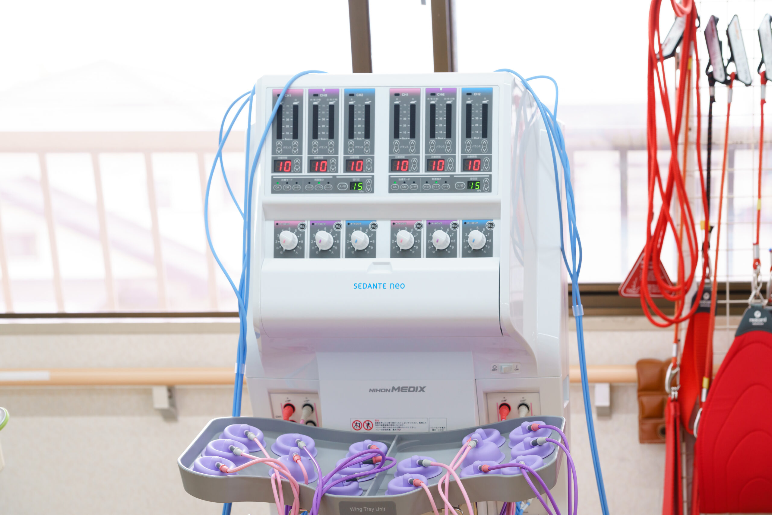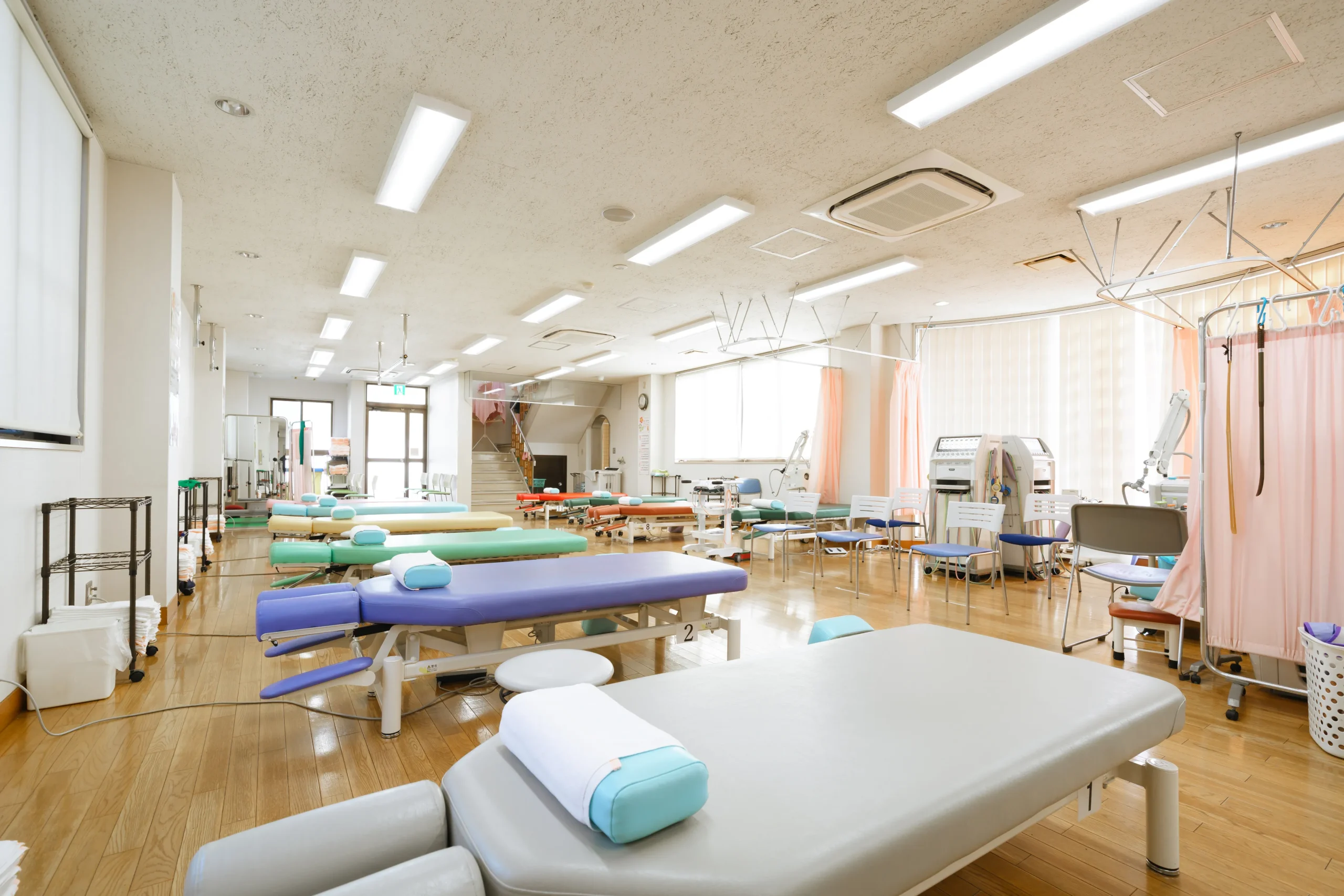 128㎡の広い訓練室の中に多くの物理療法機器を取りそろえてあり症状にあった選択が可能です。